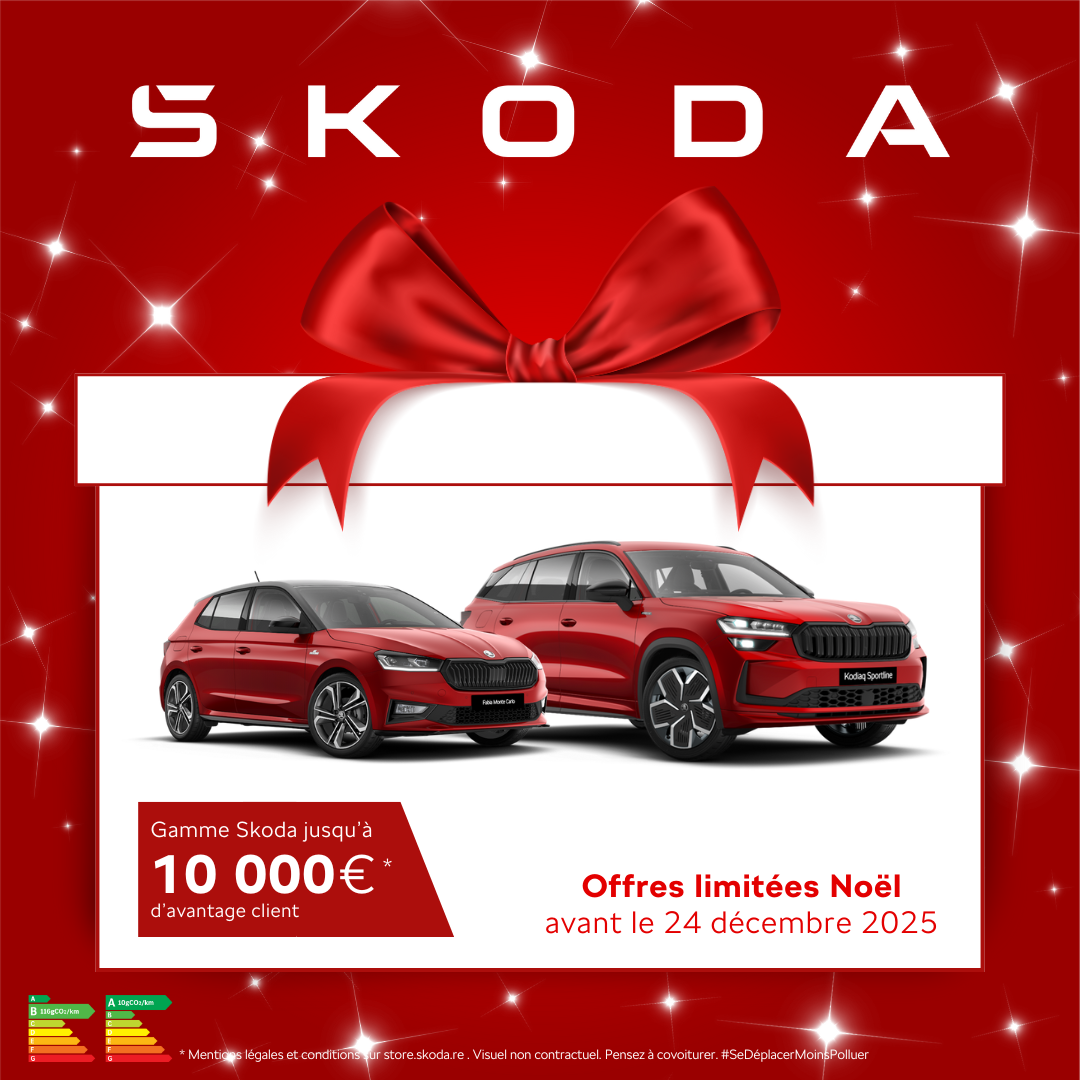 *Jusqu’à 10 000€ d’avantage client sur une sélection de véhicules Skoda neufs, dans la limite des stocks disponibles. Offre valable du 27 novembre 2025 au 24 décembre 2025. Détail des conditions en concession. Photos non contractuelles. Offre non cumulable, réservée aux particuliers dans le réseau Cotrans Skoda – RCS St Denis 444 285 825 participant et sous réserve d’acceptation par AUTOP OI, SA au capital de 224 000€ – siège social : 22 rue Pierre Aubert – CS91028 974995 Ste Clotilde – RCS St Denis 379 293 400. N° Orias 08 040 912 (www.orias.fr) Voir conditions en concession.