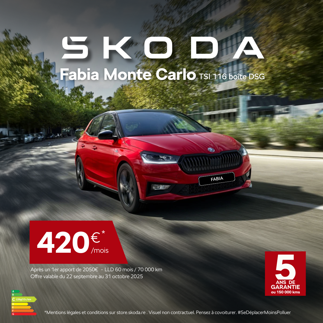 *Fabia Monte carlo TSI 116 DSG : Exemple pour la location longue durée d’une Fabia Monte carlo TSI 116 DSG sur 60 mois et 70 000 km acheté neuf avant le 31/10/2025 : 59 loyers mensuels de 420€ TTC clés en mains, après un premier loyer majoré de 2050 €. Coût du kilomètre supplémentaire entre 0 et 10 000 km : 0,11€, au-delà 0,20€. Consommation en cycle mixte (l/100km) : 5,5- Emissions de CO² en cycle mixte WLTP (g/km) : 126. Photos non contractuelles. Offre non cumulable, réservée aux particuliers dans le réseau Cotrans Skoda – RCS St Denis 444 285 825 participant et sous réserve d’acceptation par AUTOP OI, SA au capital de 224 000€ – siège social : 22 rue Pierre Aubert – CS91028 974995 Ste Clotilde – RCS St Denis 379 293 400. N° Orias 08 040 912 (www.orias.fr) Voir conditions en concession.