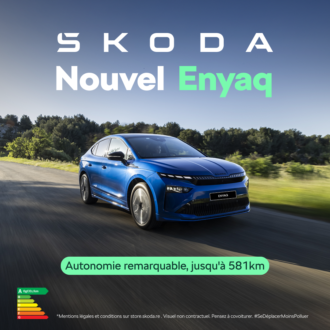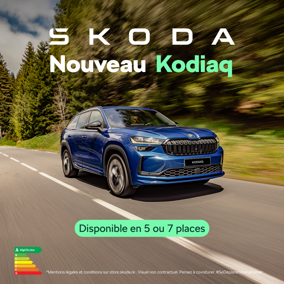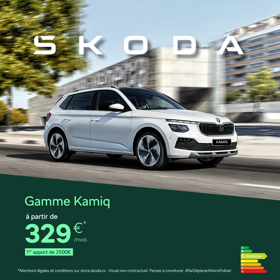 ** Gamme Kamiq : Exemple pour la location longue durée d’un Kamiq Essentiel TSI 95 sur 60 mois et 70 000 km acheté neuf avant le 31/10/2025 : 59 loyers mensuels de 329€ TTC hors frais de carte grise et malus, après un premier loyer majoré de 2500 €. Coût du kilomètre supplémentaire entre 0 et 10 000 km : 0,11€, au-delà 0,20€. Consommation en cycle mixte (l/100km) : 5,5 – Emissions de CO² en cycle mixte WLTP (g/km) : 124. Photos non contractuelles. Offre non cumulable, réservée aux particuliers dans le réseau Cotrans Skoda – RCS St Denis 444 285 825 participant et sous réserve d’acceptation par AUTOP OI, SA au capital de 224 000€ – siège social : 22 rue Pierre Aubert – CS91028 974995 Ste Clotilde – RCS St Denis 379 293 400. N° Orias 08 040 912 (www.orias.fr) Voir conditions en concession.