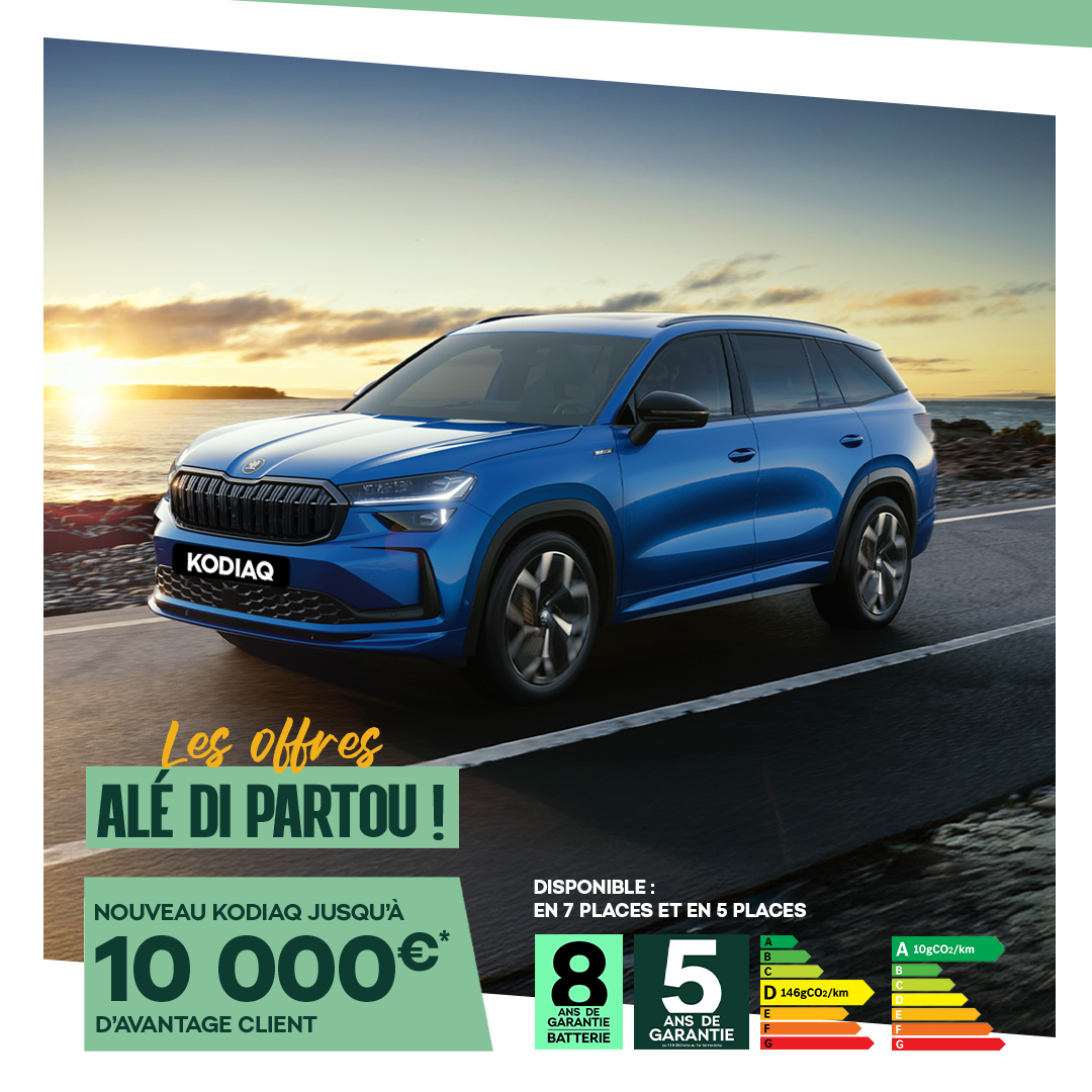 ****Jusqu’à 10 000€ d’avantage client pour l’achat d’un Kodiaq Sportline 2l TDI 150ch DSG neuve achetée et livrée avant le 30 novembre 2025. Consommation mixte WLTP (l/100km) : 5,6 – Emissions de CO² (g/km) WLTP : 146. Dans la limite des stocks disponibles. Visuels non contractuels . Jusqu’à 10 000€ d’avantage client pour l’achat Kodiaq Sportline 1,5l TSI 204ch neuve achetée et livrée avant le 30 novembre 2025.Consommation mixte WLTP (l/100km) : 0,4 – Emissions de CO² (g/km) WLTP : 10. Dans la limite des stocks disponibles. Visuels non contractuels.